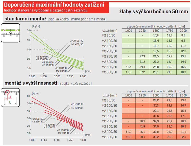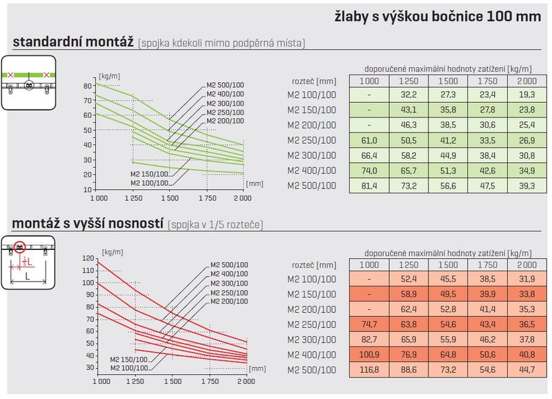 V případě uchycení žlabu držáky DZM 3/100, DZM 3/150, DZM4 a DZM 6 je nutné brát v úvahu, že se nejedná o montáž s opěrnými místy pod žlabem, nýbrž o zavěšení žlabu k vrchnímu lemovému drátu. V tomto případě je zapotřebí násobit veškeré hodnoty udané
